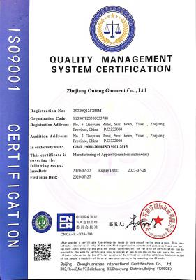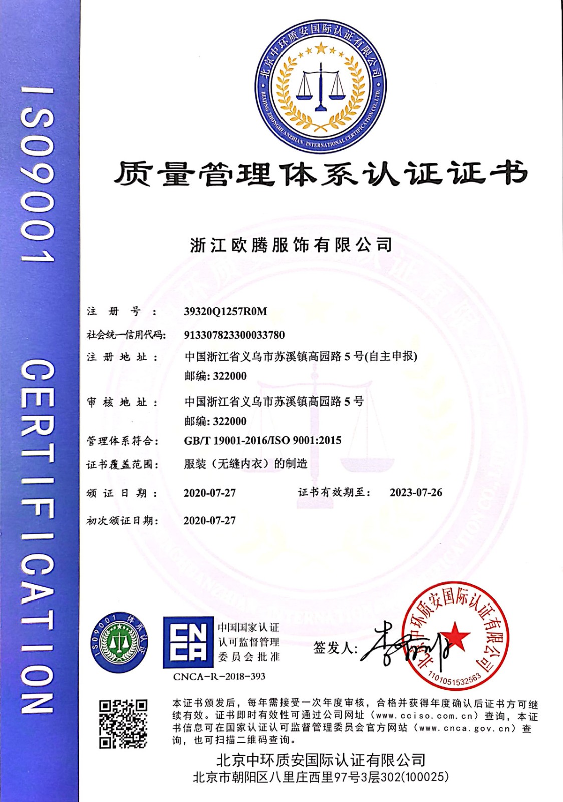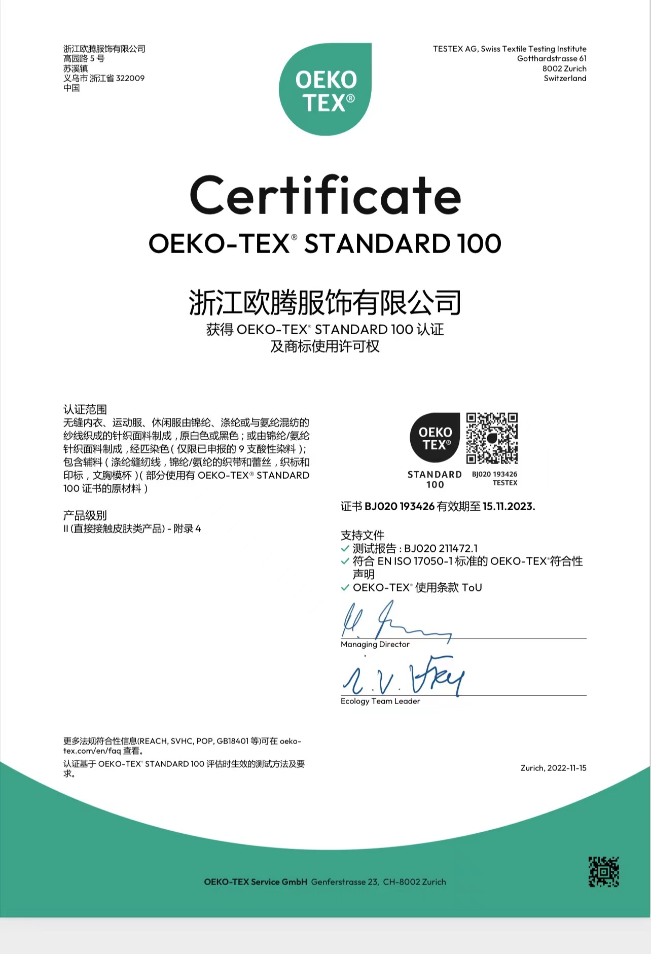 浙江歐騰服飾有限公司位于世界小商品之都-義烏。創(chuàng)立于2015年,是一家專業(yè)生產(chǎn)無縫針織運(yùn)動(dòng)服飾和內(nèi)衣的工貿(mào)一體企業(yè),擁有自主出口權(quán)。 工廠的占地面積約16000平方米 ,引進(jìn)了大型圣東尼、高騰等多種先進(jìn)的制衣設(shè)備300余臺(tái)。月產(chǎn)能可達(dá)90萬件。 歐騰服飾每年投入近百萬資金打樣開發(fā)新產(chǎn)品,有著一支高素質(zhì)設(shè)計(jì)、技術(shù)員工隊(duì)伍。工廠先后通過了ISO 9001質(zhì)量管理體系認(rèn)證、BSCI認(rèn)證、GRS認(rèn)證、OEKO-TEX國際生態(tài)紡織品認(rèn)證等多項(xiàng)專利檢測(cè)報(bào)告。可提供OEM&ODM服務(wù)。歐騰服飾以一套完整、科學(xué)的質(zhì)量管理體系,生產(chǎn)的服裝從原材料紗線到成衣,質(zhì)量完全能夠滿足國內(nèi)、國際質(zhì)量要求。獲得了客戶一致好評(píng)。工廠先后獲得省科技型企業(yè)、國家高新企業(yè)、義烏市誠信講信用單位、規(guī)上企業(yè)、信用AAA級(jí)等榮譽(yù)。